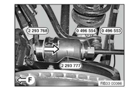 Pull out rubber mount with special tools 0 496 553, 0 496 554, 2 293 768 and 2 293 777 out of wheel carrier against direction of travel (F).