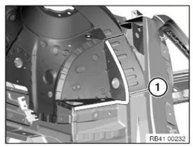 Open welded connections in area (1). Remove outer section of wheel arch.