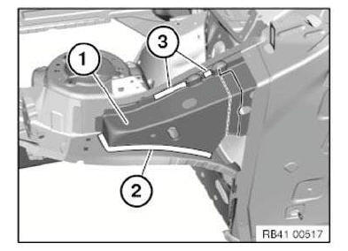 Open welded connections in area (3) and remove wheel arch part section.